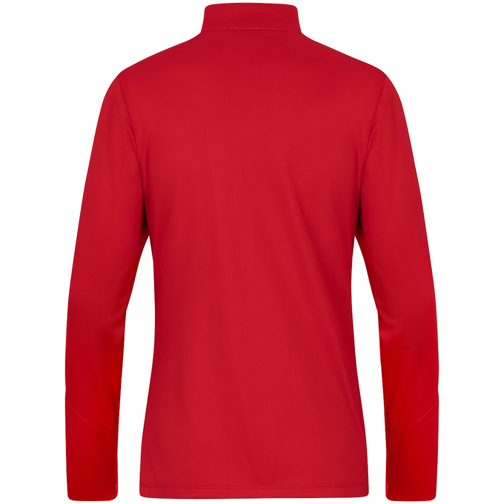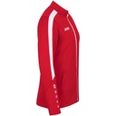 Die Jako Power Polyesterjacke für Damen - eine stilvolle und funktionelle Jacke für vielseitiges Training. Das sportliche Design setzt auf Kontrastfarben, hier in rot-weiß. Diese sind als Materialeinsatz und als markentypische Punkte auf den Ärmeln sichtbar.