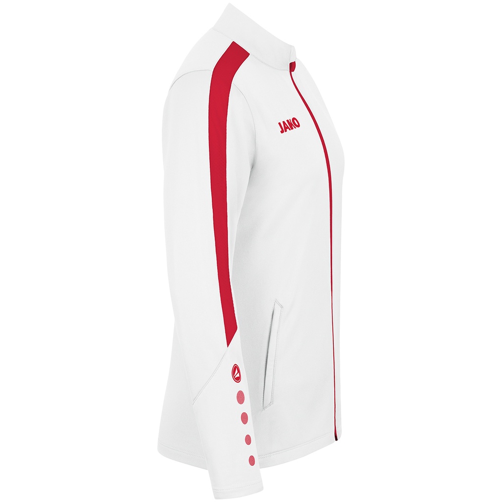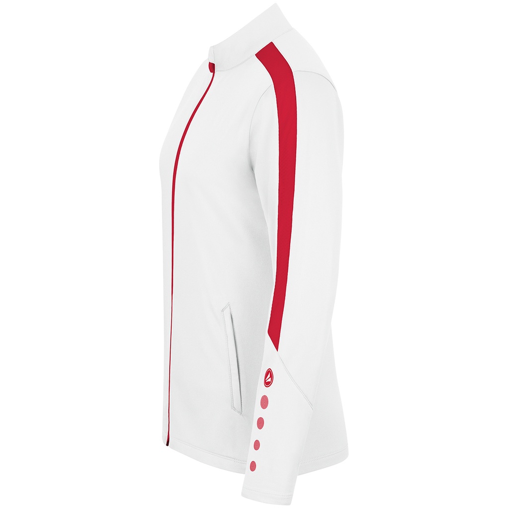 Die Jako Power Polyesterjacke für Damen - eine stilvolle und funktionelle Jacke für vielseitiges Training. Das sportliche Design setzt auf Kontrastfarben, hier in weiß-rot. Diese sind als Materialeinsatz und als markentypische Punkte auf den Ärmeln sichtbar.